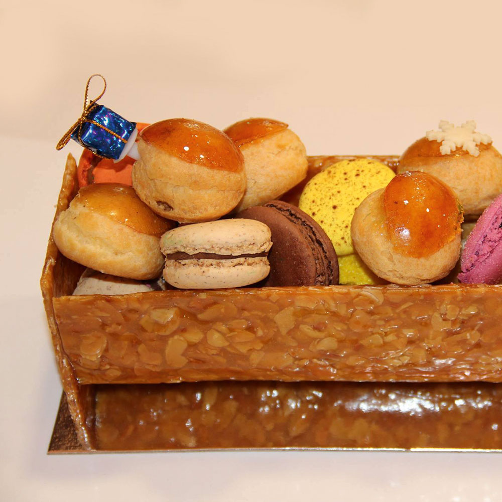 Dans un berceau de nougatine, un assortiment de choux et macarons