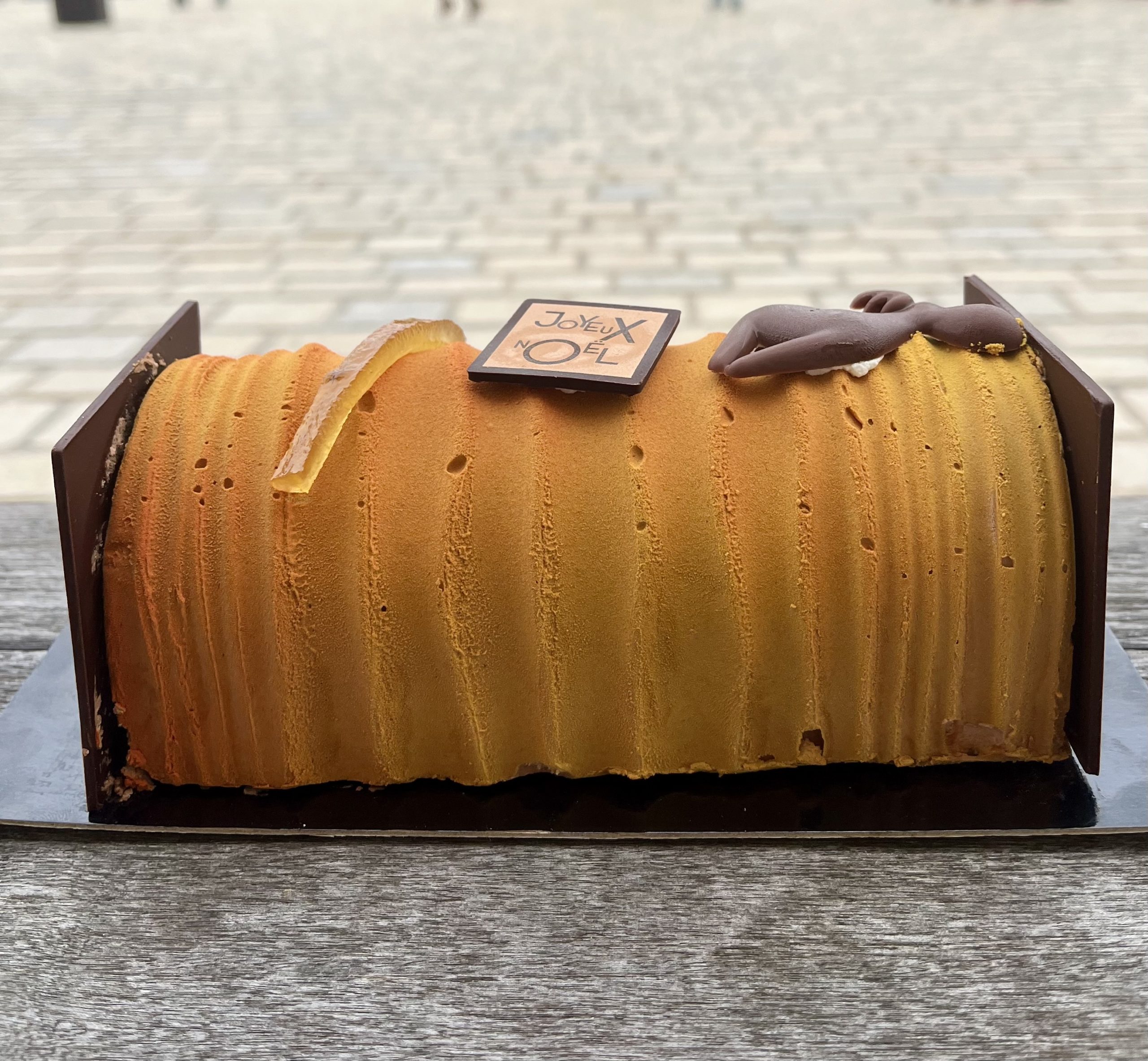 Une mousse au CHOCOLAT Illanka 63% de cacao pur Pérou, un crémeux à la BERGAMOTE de Sicile, un biscuit MACARON et une compotée de MIRABELLE